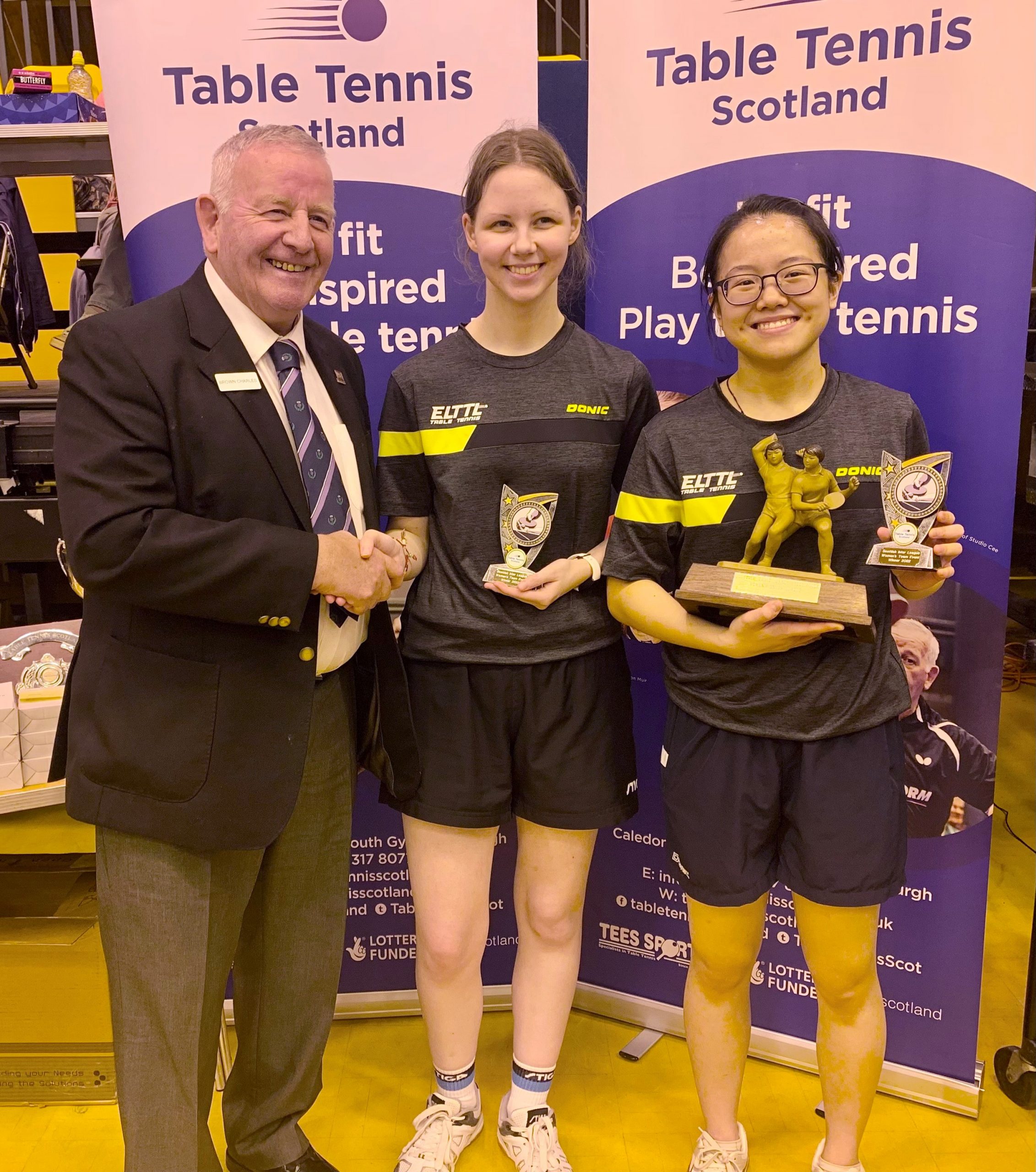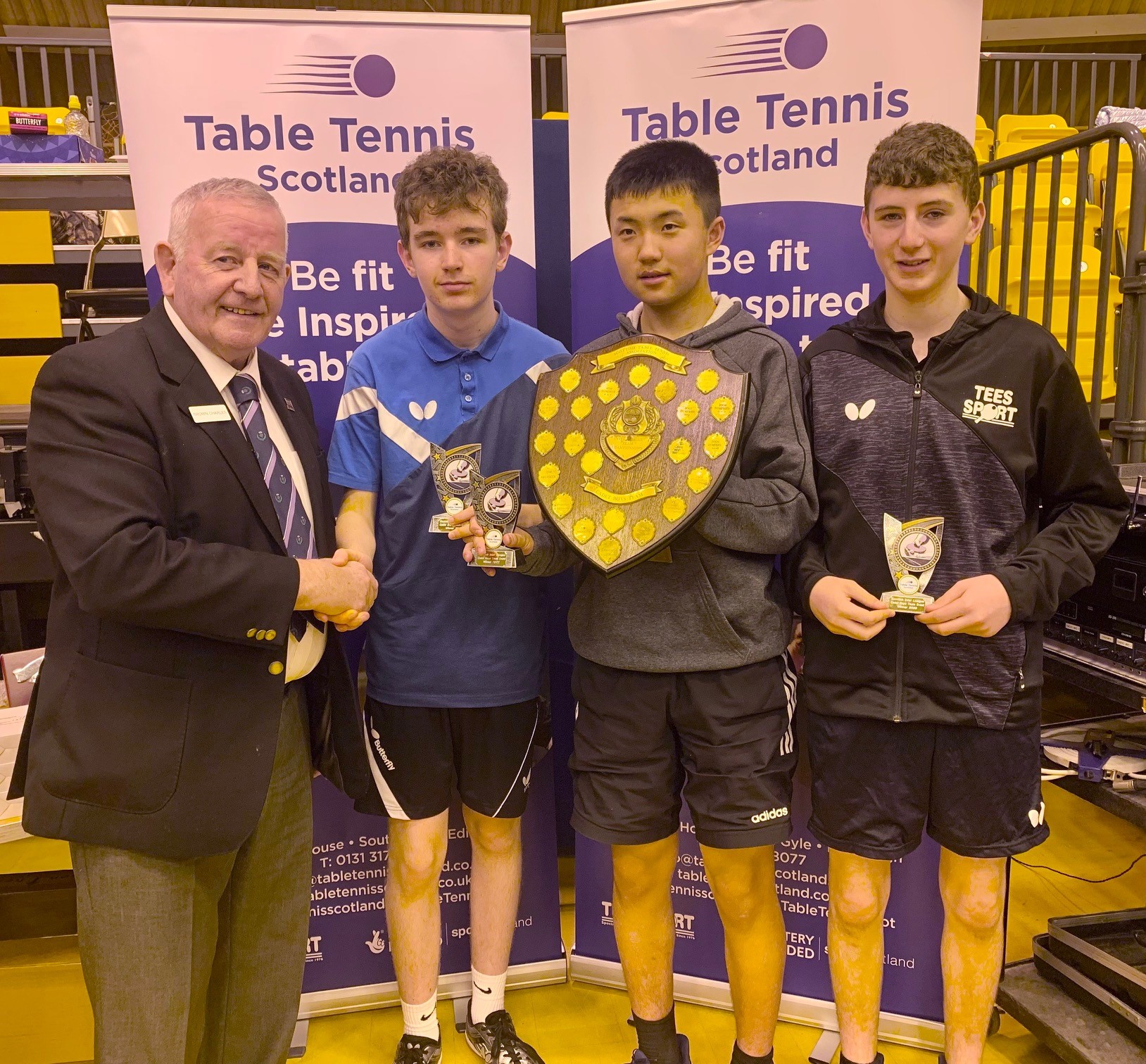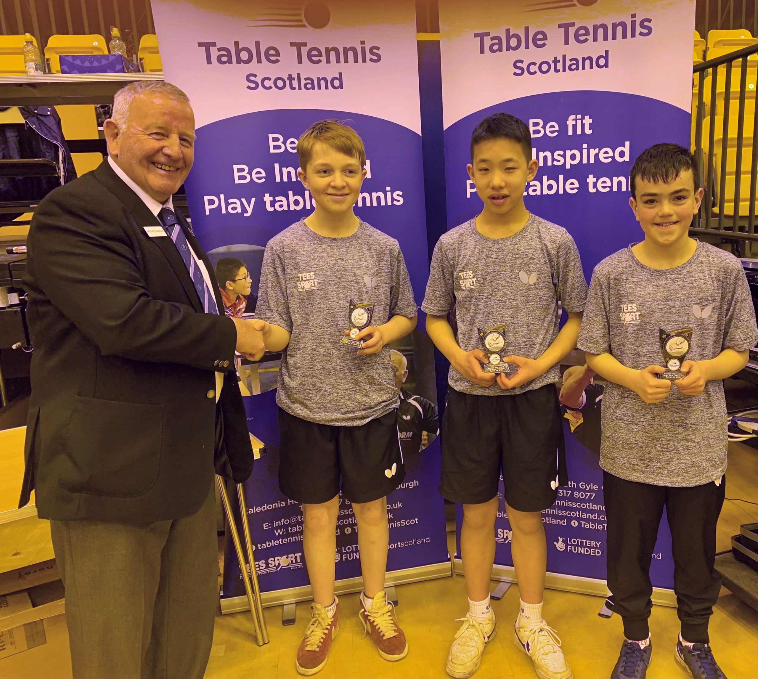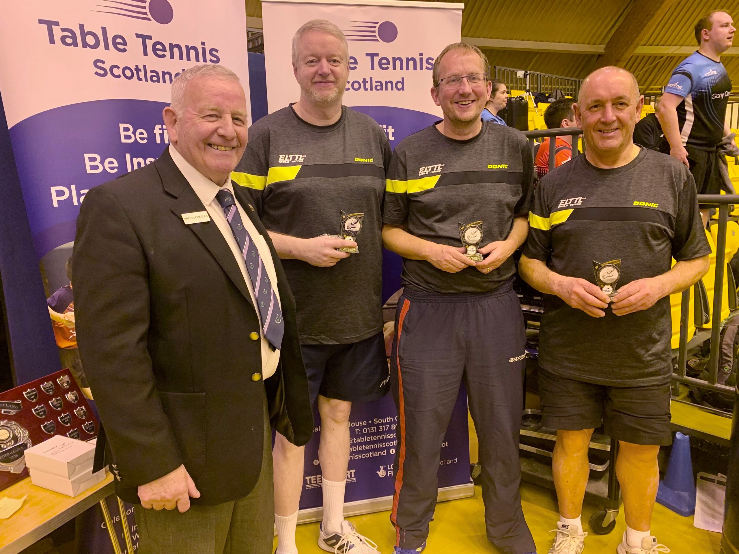 Edinburgh were prevalent in the senior events taking the Men’s, Ladies and Men’s Vets titles while Dundee claimed the Ladies Vets title. Both West of Scotland Junior boys and girls teams dominated their respective events winning all their matches 3-0 while Aberdeen scored success in both the Cadet Boys and Minor Boys categories. Due to the fact that there were only four Minor Boys teams entered, the sole Cadet Girls team of Edinburgh and Minor Girls team of Aberdeen joined the group which ensured plenty of matches in both singles and doubles giving some of the younger players great experience, especially for those competing in the upcoming British Primary Championships this weekend. Edinburgh’s overall team performance ensured a comfortable points advantage and Gordon Muir was delighted to pick up the Stewart McGowan Trophy.