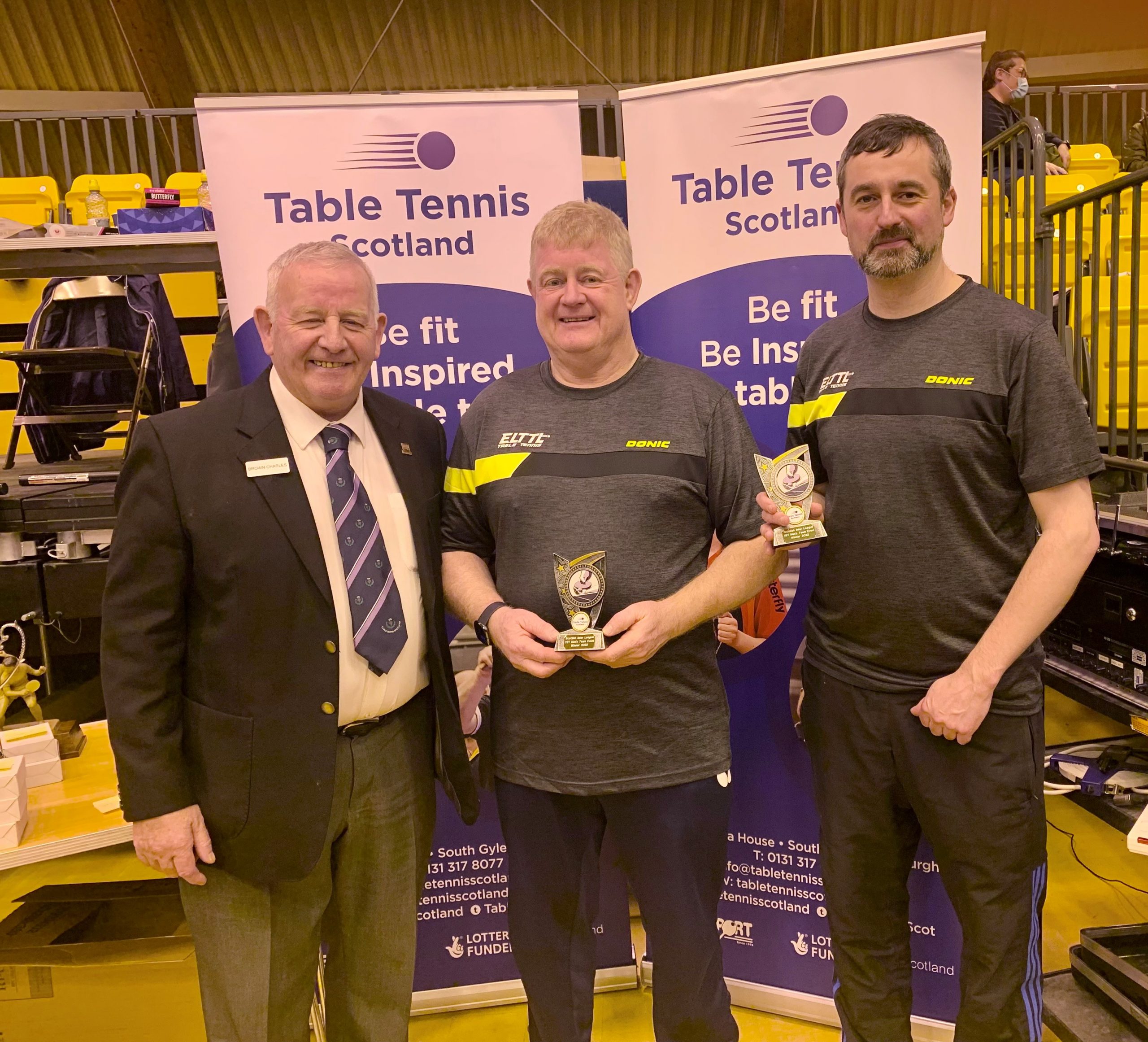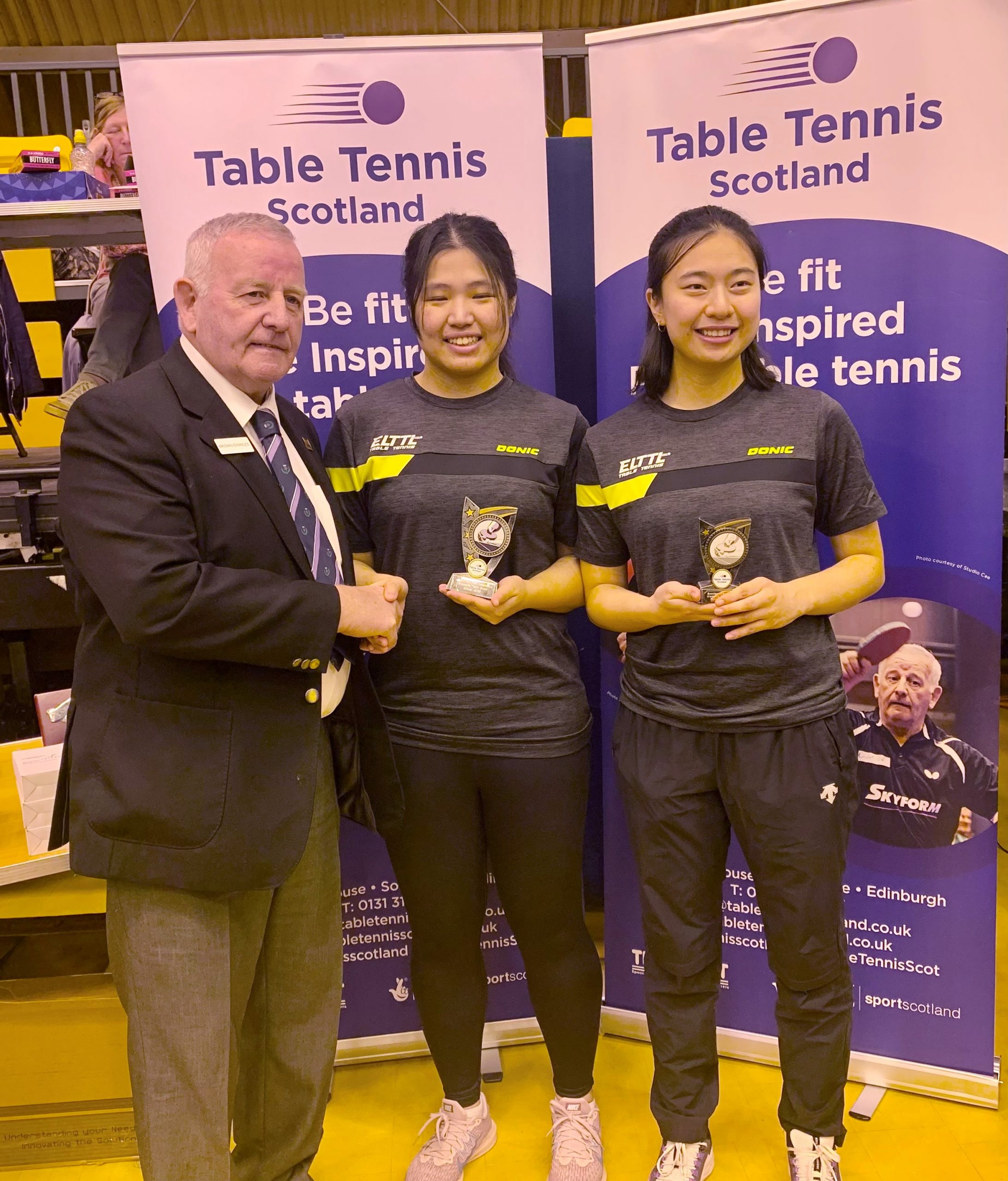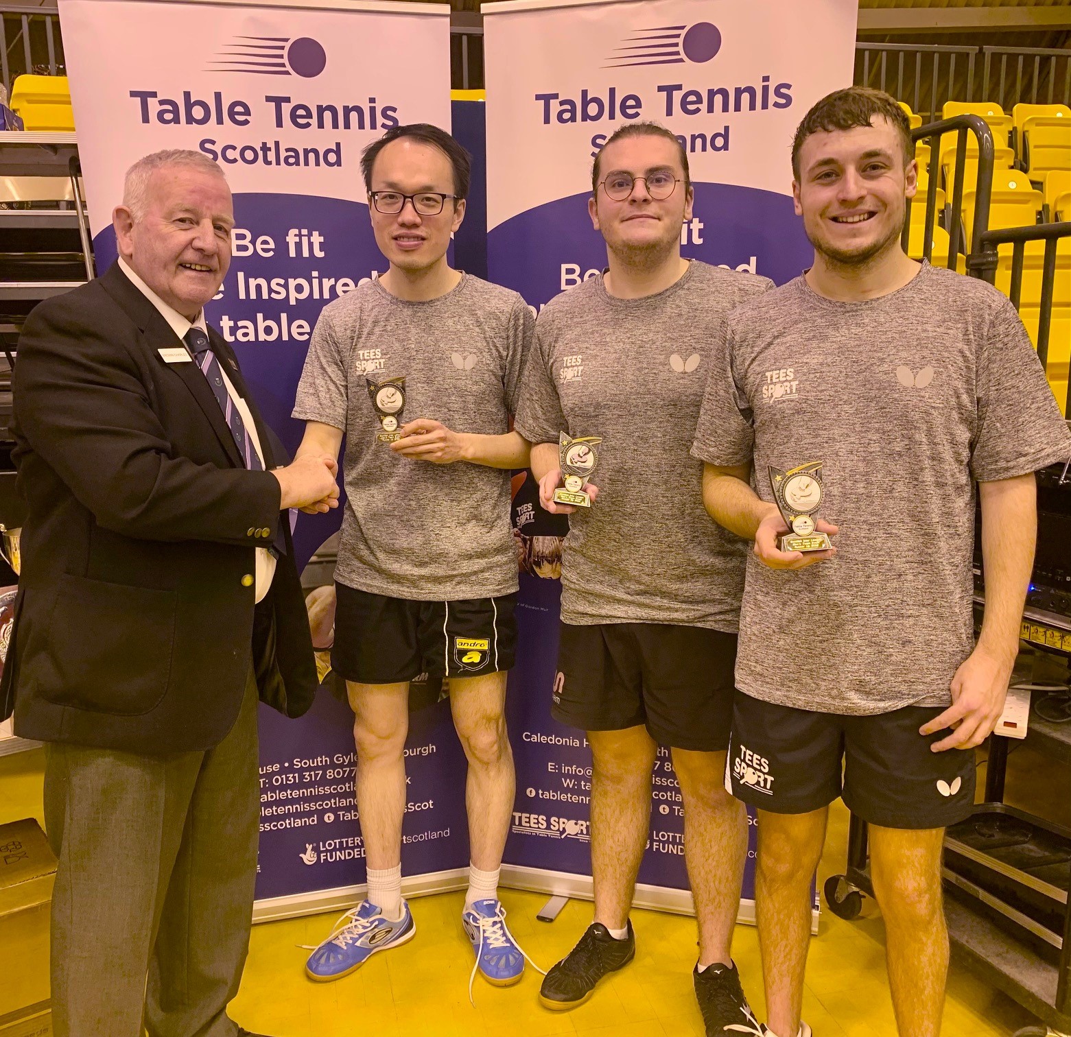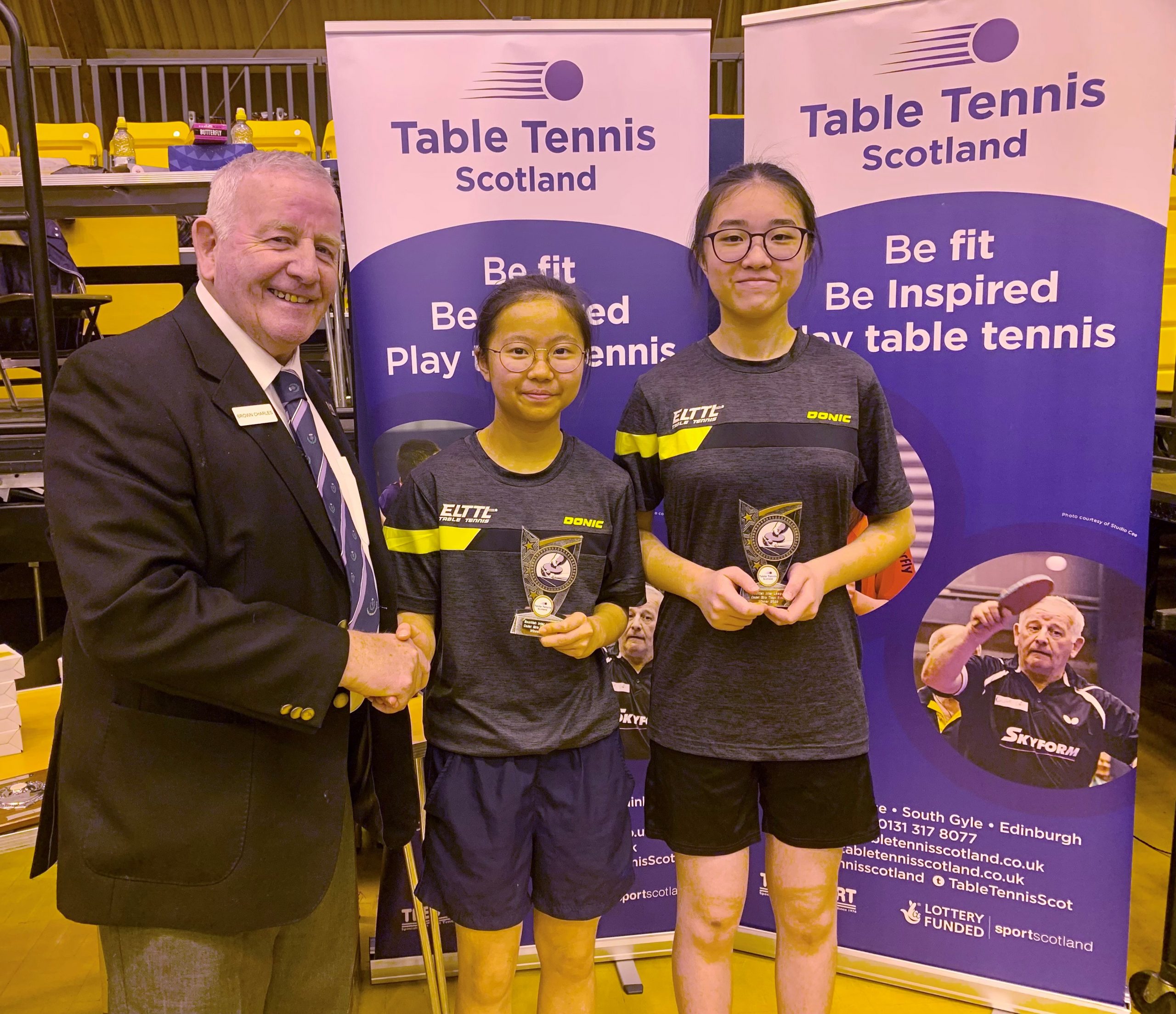 Edinburgh were prevalent in the senior events taking the Men’s, Ladies and Men’s Vets titles while Dundee claimed the Ladies Vets title. Both West of Scotland Junior boys and girls teams dominated their respective events winning all their matches 3-0 while Aberdeen scored success in both the Cadet Boys and Minor Boys categories. Due to the fact that there were only four Minor Boys teams entered, the sole Cadet Girls team of Edinburgh and Minor Girls team of Aberdeen joined the group which ensured plenty of matches in both singles and doubles giving some of the younger players great experience, especially for those competing in the upcoming British Primary Championships this weekend. Edinburgh’s overall team performance ensured a comfortable points advantage and Gordon Muir was delighted to pick up the Stewart McGowan Trophy.