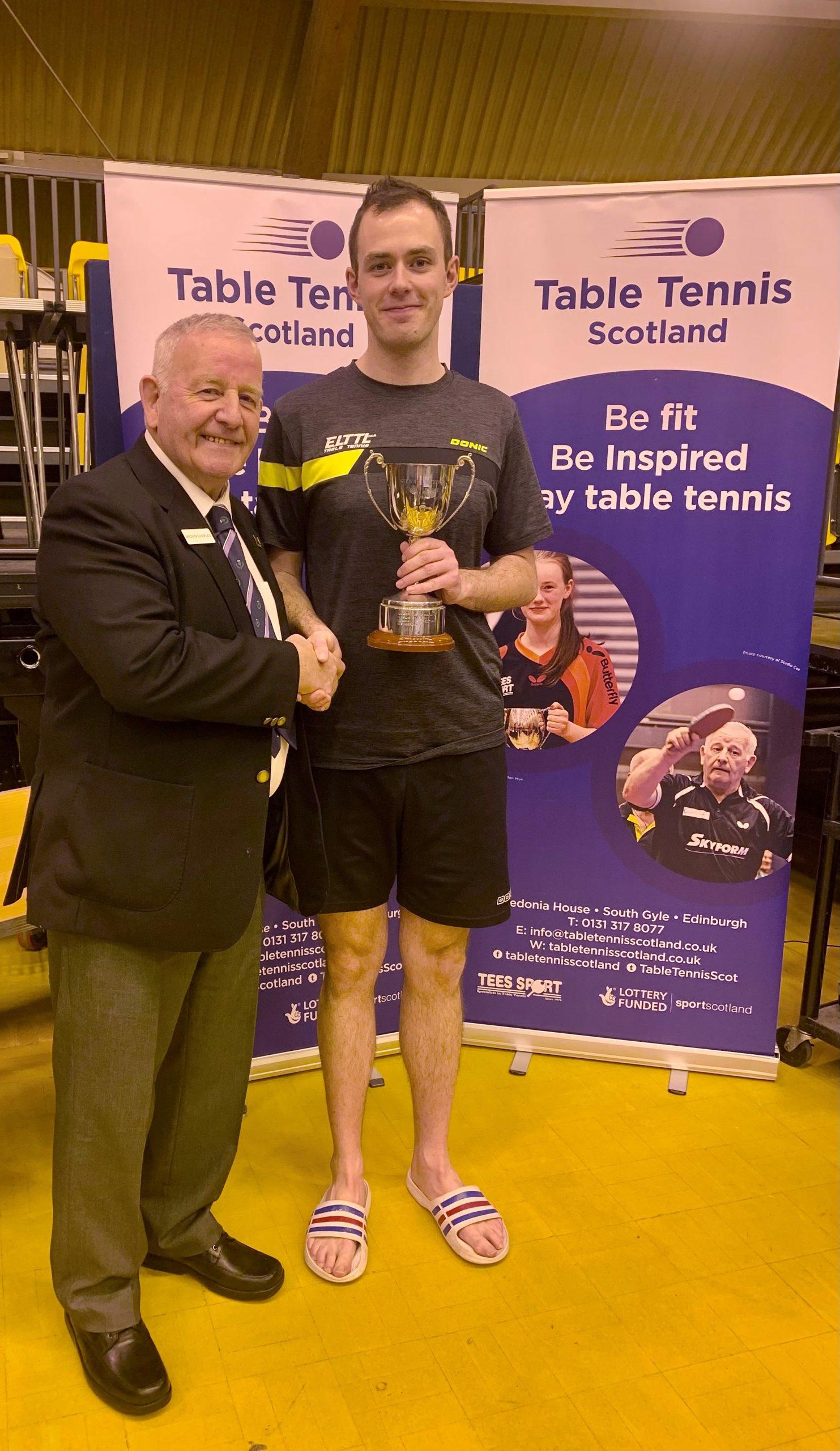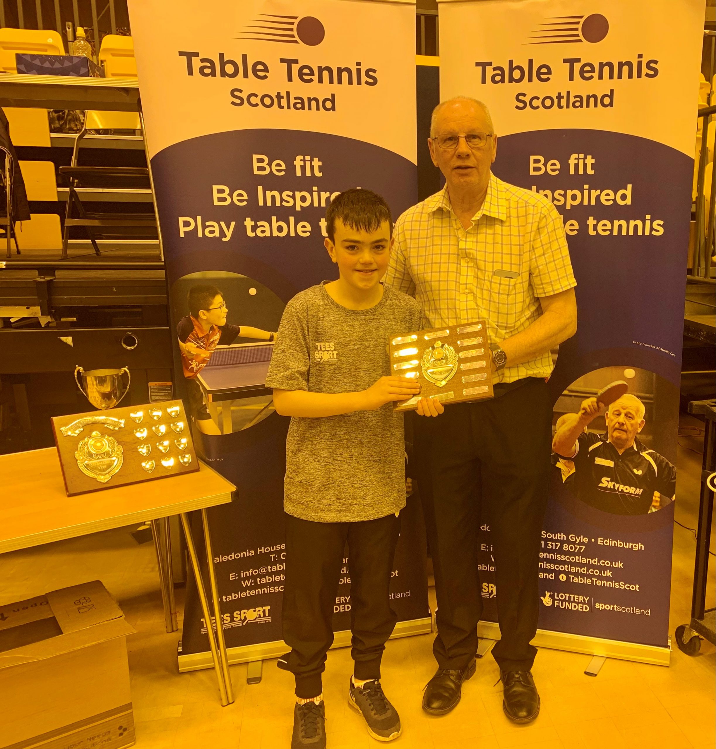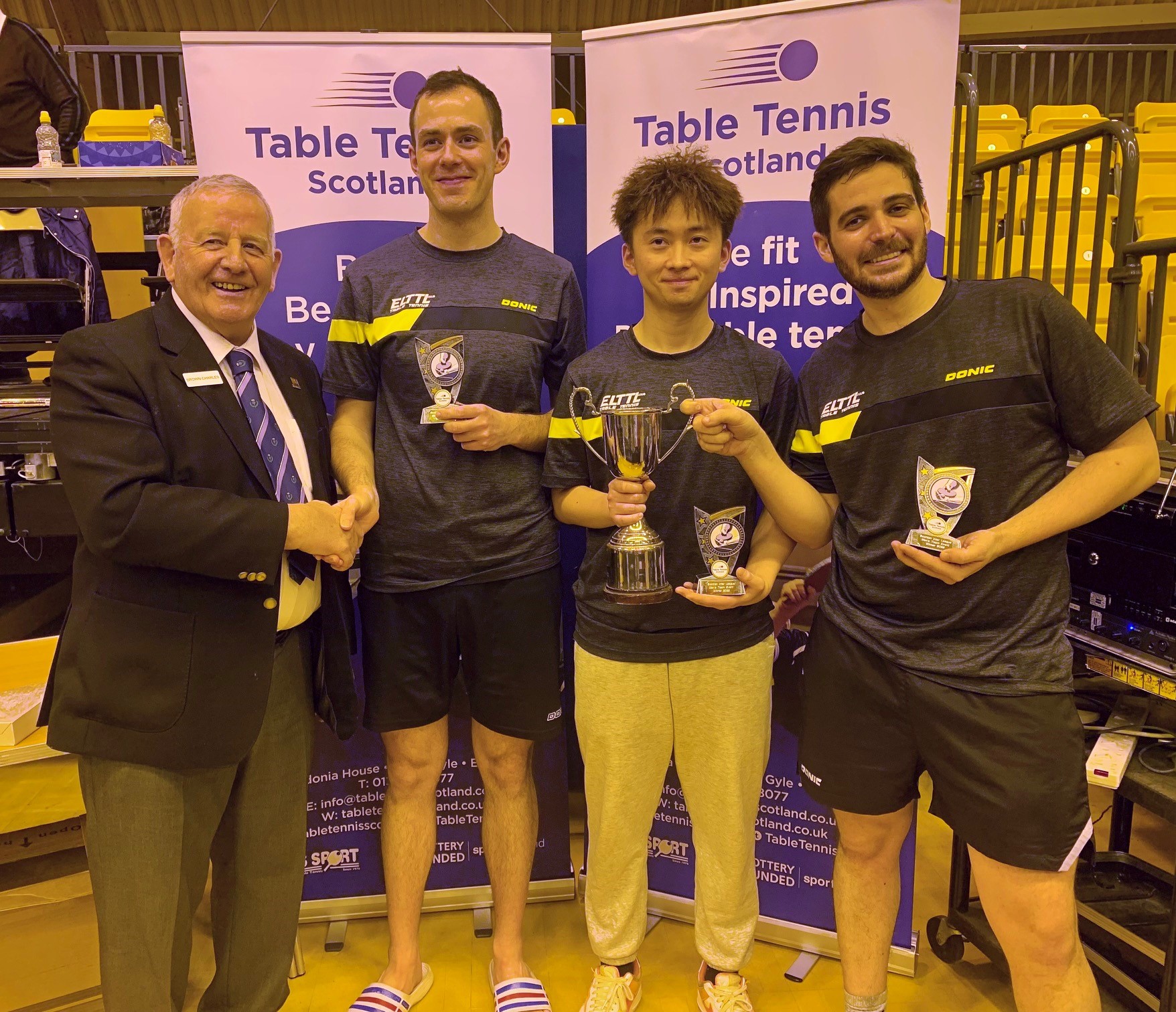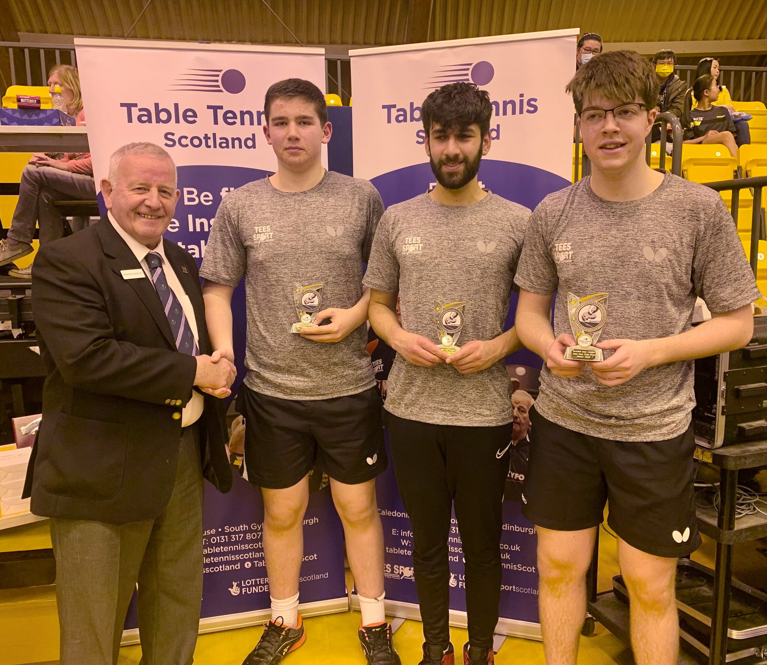 Edinburgh were prevalent in the senior events taking the Men’s, Ladies and Men’s Vets titles while Dundee claimed the Ladies Vets title. Both West of Scotland Junior boys and girls teams dominated their respective events winning all their matches 3-0 while Aberdeen scored success in both the Cadet Boys and Minor Boys categories. Due to the fact that there were only four Minor Boys teams entered, the sole Cadet Girls team of Edinburgh and Minor Girls team of Aberdeen joined the group which ensured plenty of matches in both singles and doubles giving some of the younger players great experience, especially for those competing in the upcoming British Primary Championships this weekend. Edinburgh’s overall team performance ensured a comfortable points advantage and Gordon Muir was delighted to pick up the Stewart McGowan Trophy.